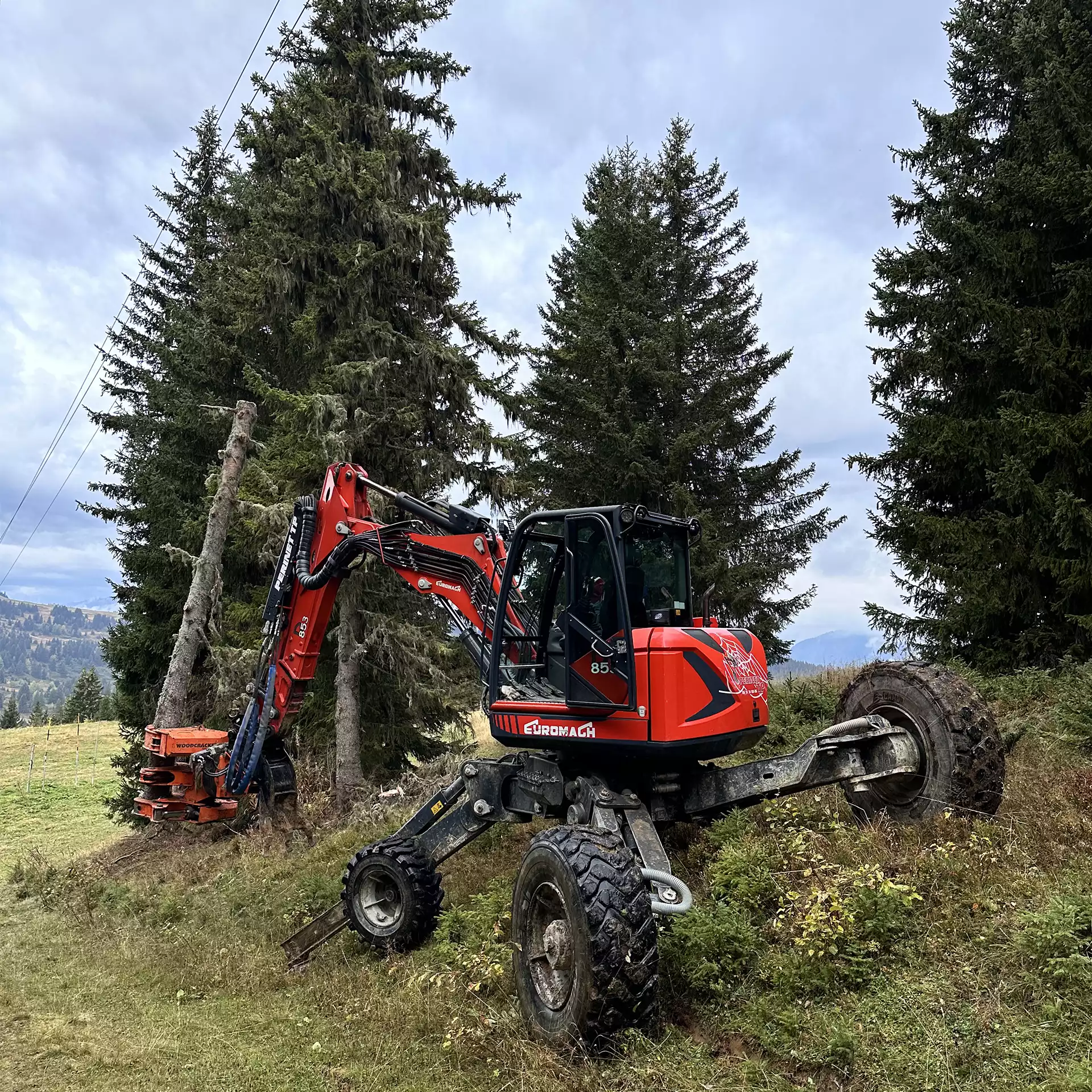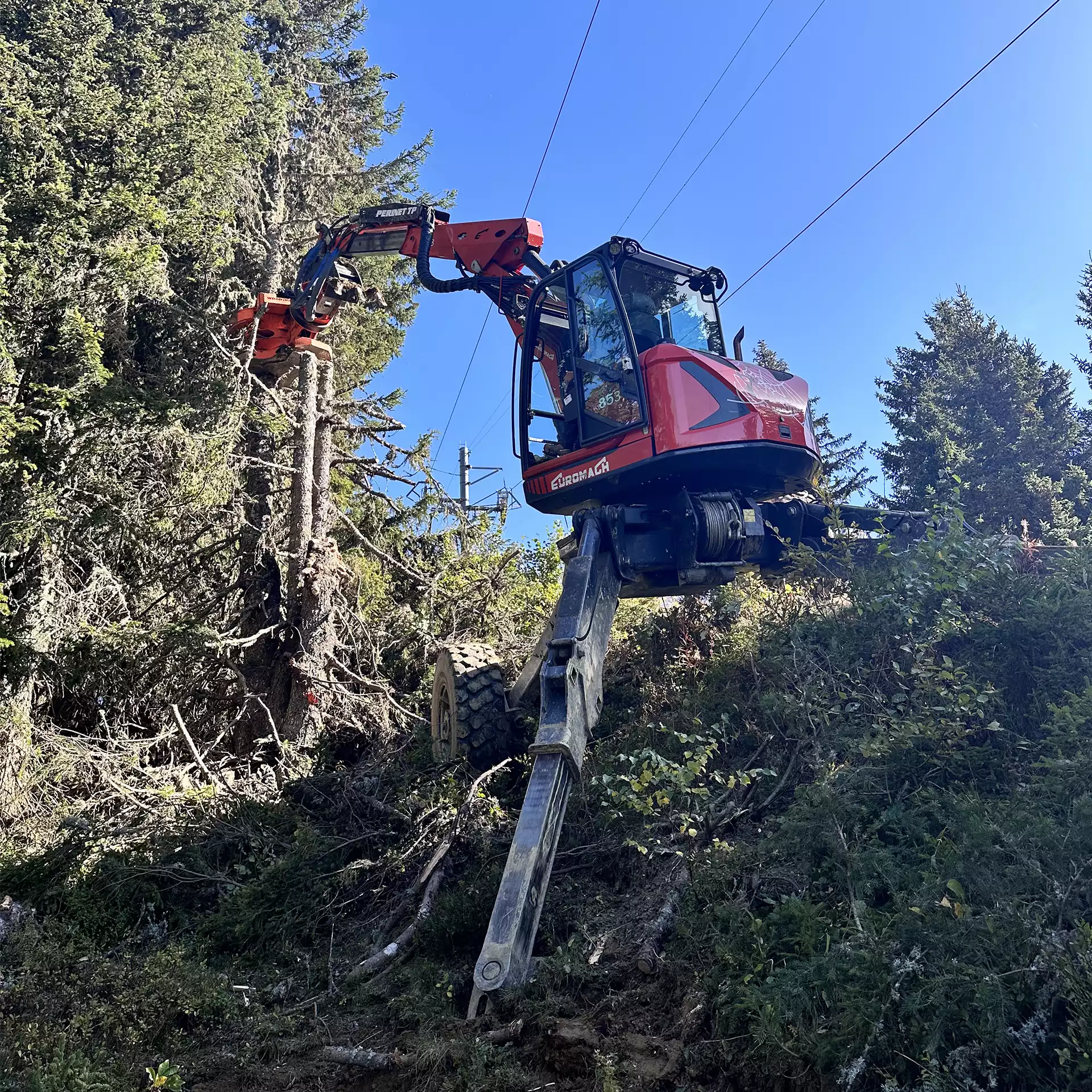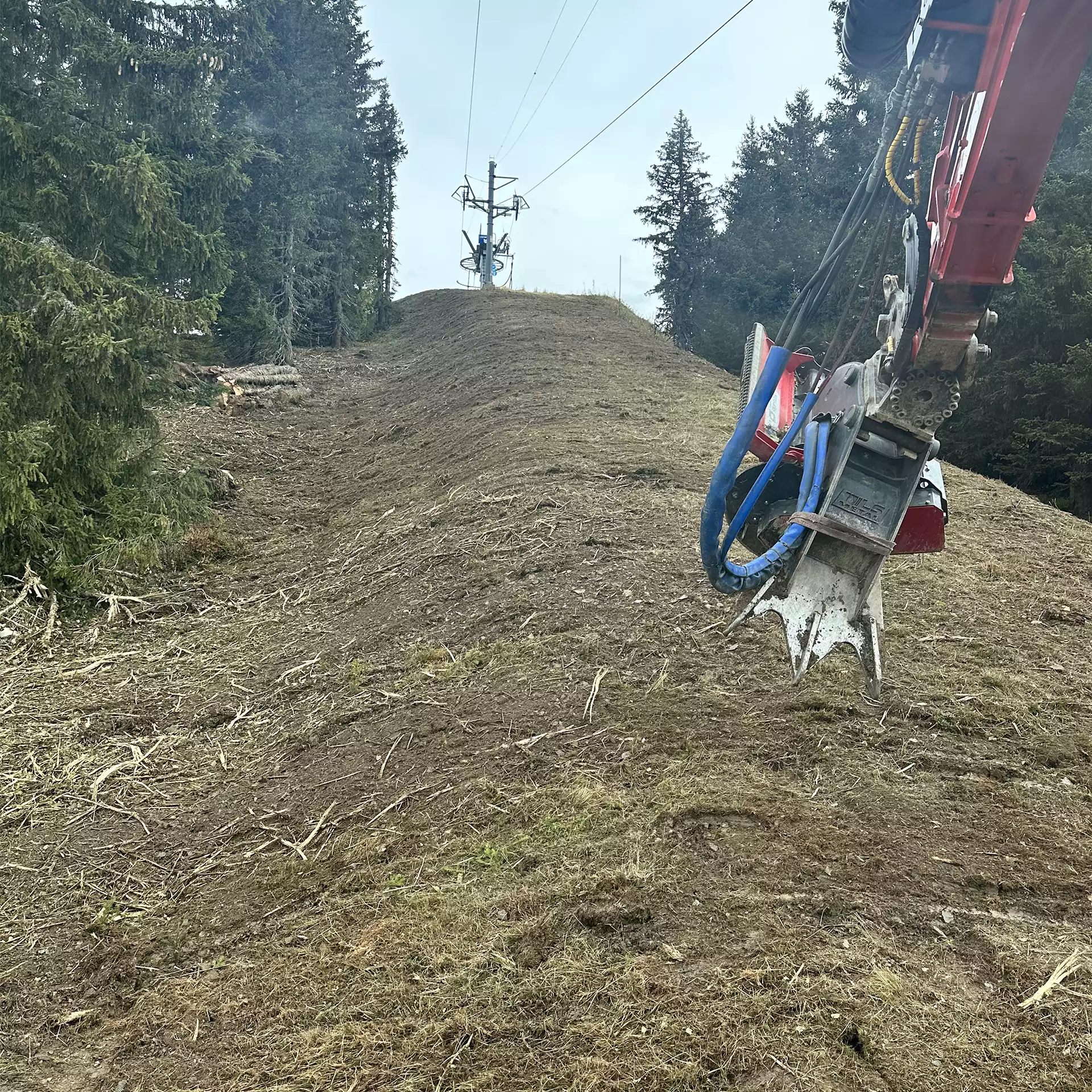 Lors de notre intervention sur le domaine skiable des Saisies, notre équipe a pris en charge l'abattage des arbres morts pour sécuriser la ligne d'un téléski. Ils ont utiliser notre sécateur capable de couper des arbres jusqu'à 30 cm pour un abattage sécurisé. En parallèle, nous avons également broyé les rémanents pour revaloriser les sols.