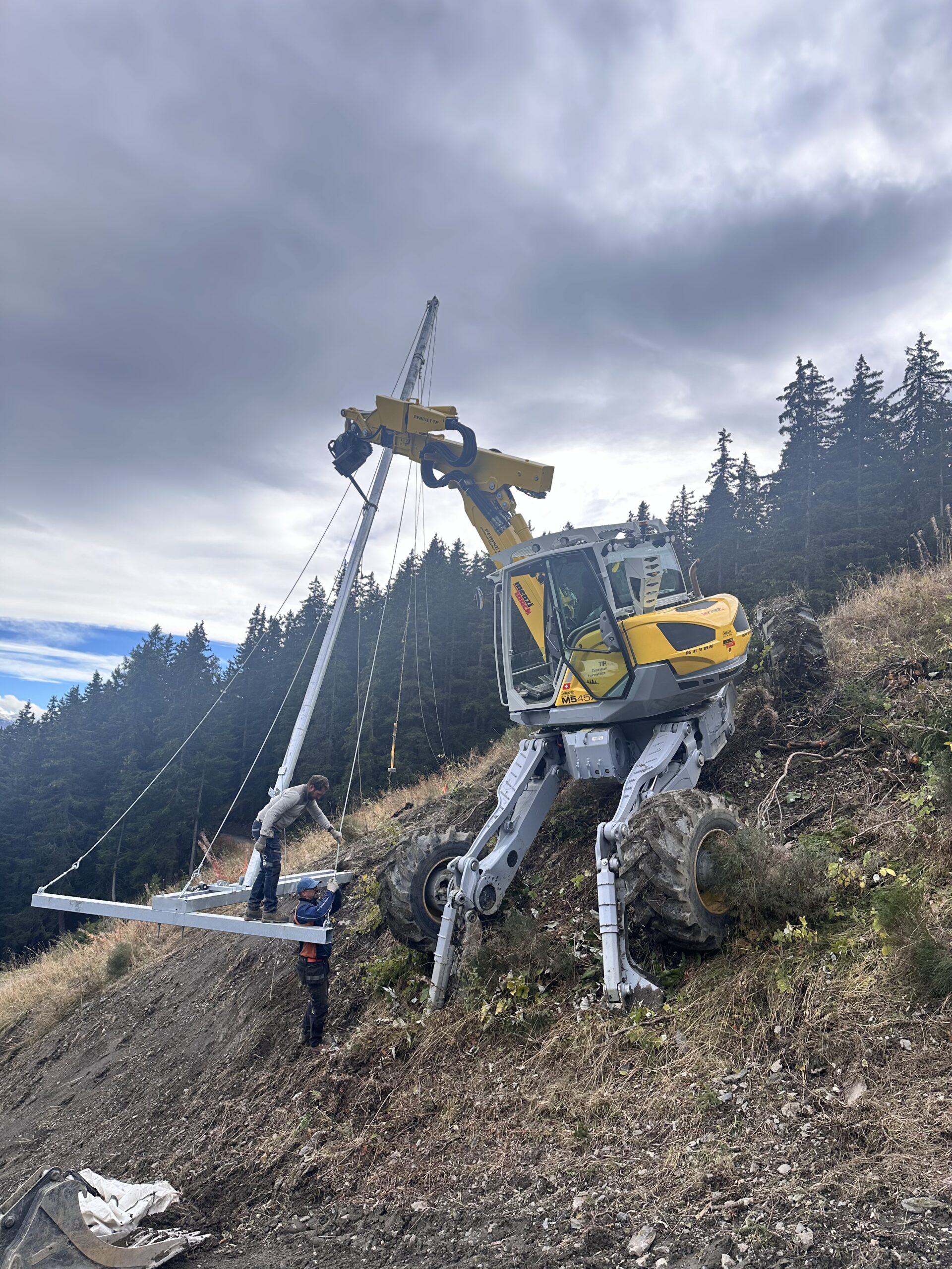 Grâce à nos pelles araignées spécialement équipées de dispositifs de levage, nous avons pu acheminer et poser les structures métalliques dans des conditions particulièrement exigeantes. Qu’il s’agisse de terrains escarpés, d’accès difficiles ou de haute altitude, nos engins nous permettent d’intervenir avec précision et efficacité, tout en garantissant la sécurité sur site.